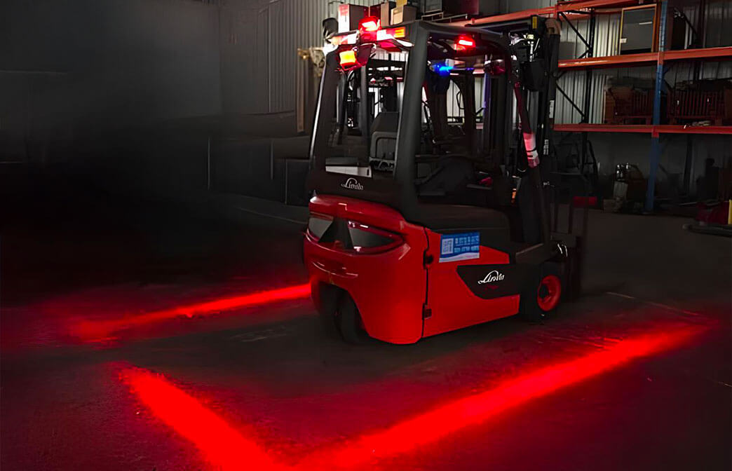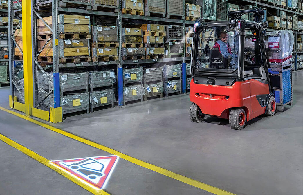 Per carrelli retrattili Linde: due linee rosse proiettate a pavimento ai lati del mezzo (“vietato entrare”), così pedoni e veicoli percepiscono la zona di rischio prima del passaggio.