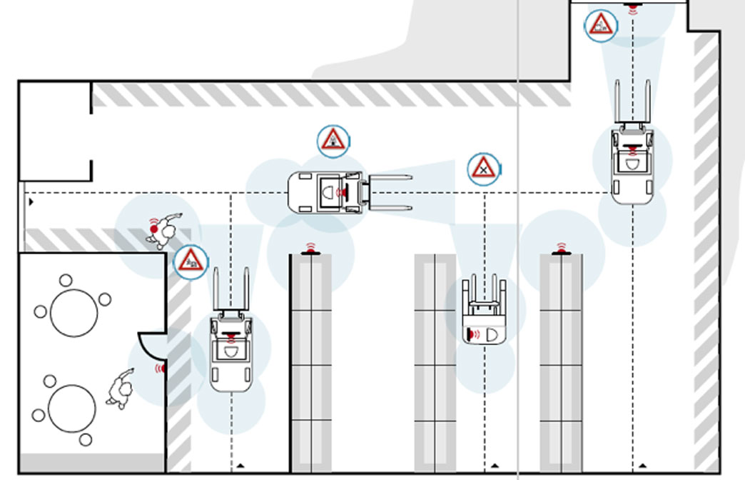 Segnali acustici, visivi (LED) e vibrazioni raggiungono pedoni e carrellisti. I moduli comunicano anche attraverso pareti e scaffali, indicando direzione e distanza del pericolo. Le zone a velocità controllata possono essere impostate su porte, passaggi o aree sensibili.