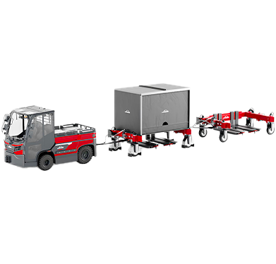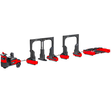 Soluzione efficiente per grandi volumi su lunghe distanze (magazzino → linee). Tre telai: C (fino a 2.000 kg), B (fino a 1.000 kg), B con barra centrale (fino a 1.600 kg) per combinare pallet, gitterbox e piccoli portacarichi nello stesso convoglio. Sterzo su tutte le ruote per precisione in corsie e curve strette. Compatibile con trattori manuali o automatici e con sistema guida trenino opzionale.